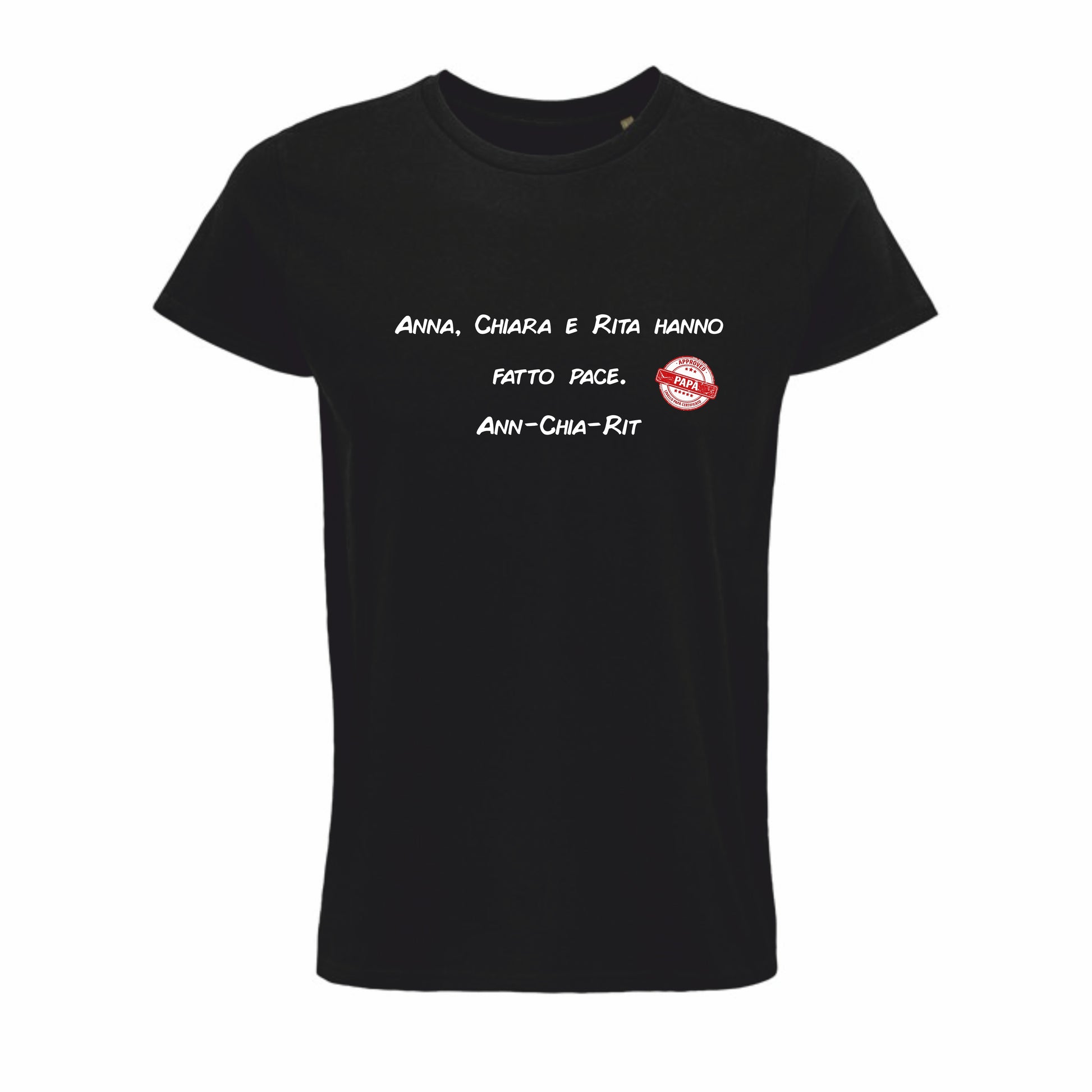 La maglietta “Anna, Chiara e Rita hanno fatto pace. Ann-Chia-Rit” è l’omaggio definitivo alle battute che fanno sospirare, ridere e alzare gli occhi al cielo nello stesso momento. Un gioco di parole così platealmente da papà da meritarsi, senza discussioni, il suo bollino “Papà approved, livello papà certificato”.