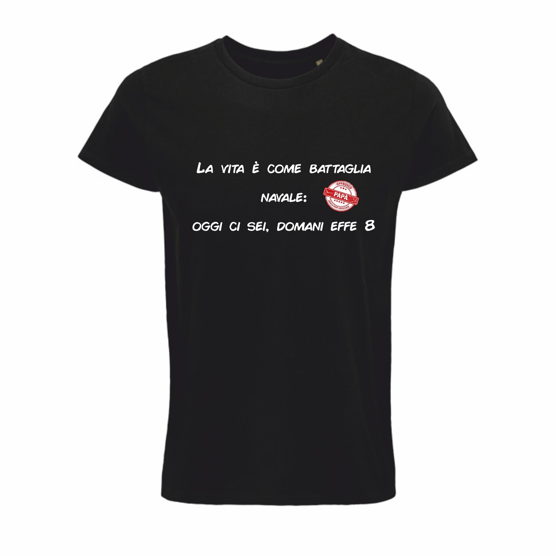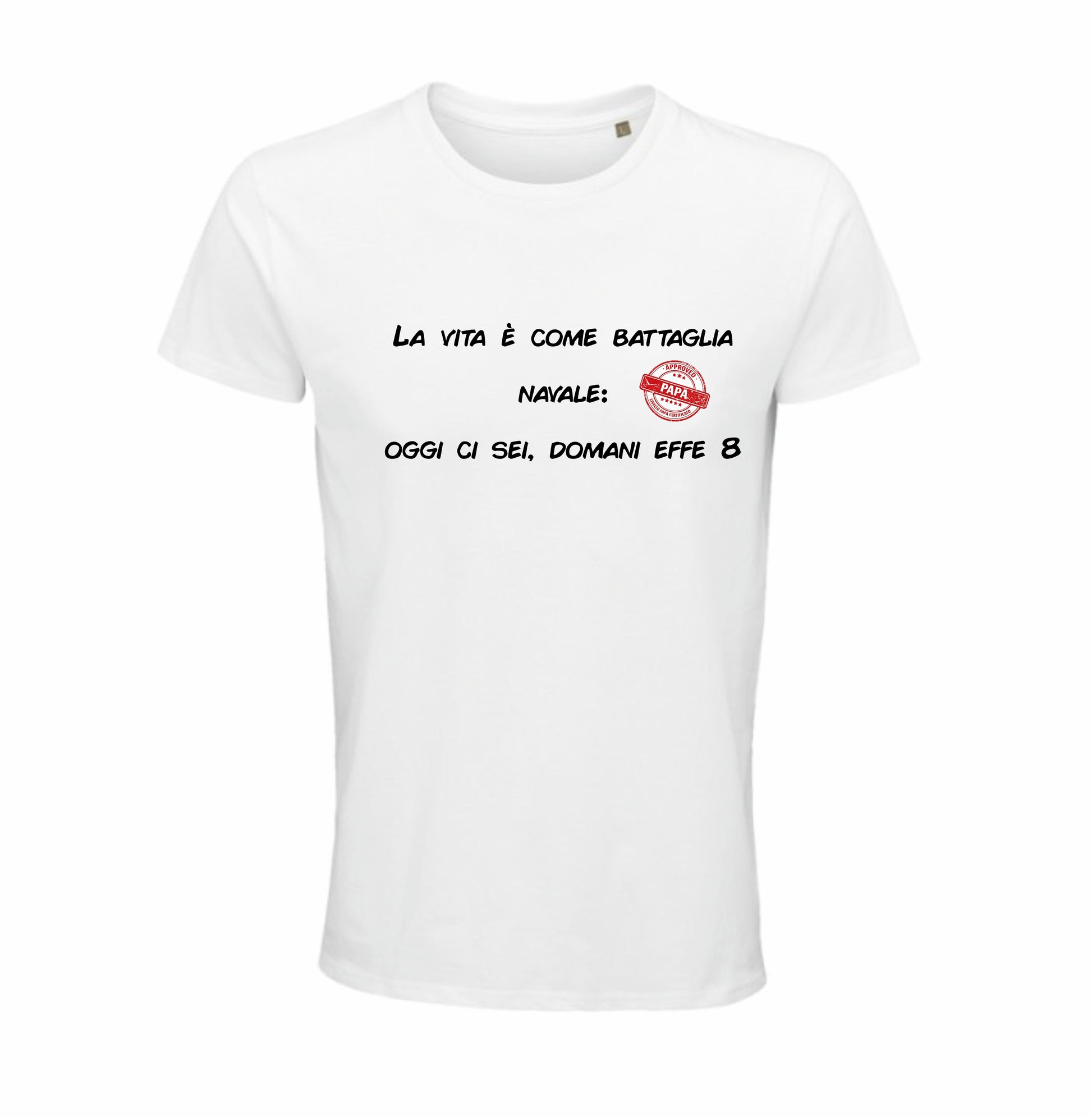 La maglietta “La vita è come battaglia navale: oggi ci sei, domani effe 8.” è una freddura che parte quasi filosofica e poi cambia rotta con un gioco di parole perfettamente da papà.